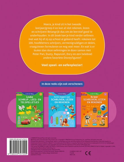 Hoera, je kind zit in het tweede leerjaar/groep vier en kan al vlot rekenen, lezen en schrijven! Belangrijk dus om de leerstof goed te onderhouden. In dit boek kan je kind verder oefenen met wat hij of zij op school al geleerd heeft: rekenen tot honderd, hoofdletters schrijven, vermenigvuldigen en delen, vraagzinnen formuleren en nog veel meer. En wat is er leuker dan deze oefeningen te doen samen met Peter Pan, Dusty, Rapunzel, Dory en een heleboel andere favoriete Disneyfiguren?