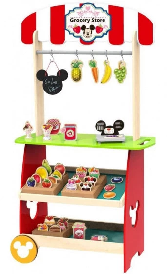 Jouw kindje voet zich een ware verkoopman met het winkeltje van Disney. In de supermarkt zijn diverse producten te vinden, zoals fruit, taartjes, ijs en potjes jam. Schijf met het krijtje de aanbieding van de dag op, en met het weegschaaltje kun je de producten wegen.